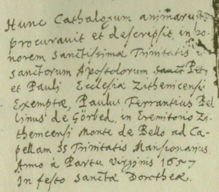 Hunc cathalogum animarum procuravit et descripsit in honorem sanctissimae Trinitatis sanctorum Apostolorum sanct Petri et Pauli Ecclesia Zithenicensis exemptae, Paulus Ferrantius Bellinus de Görbed, in eremitonis Zithenicensi monte de Bello ad Capellam SS Trinitatis Mansionnarius Anno a Partu virginis 1657 in festo sanctae Dorotheae