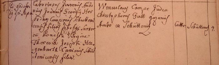 Trauzeugen: Wenzel Lampe, Richter in Schüttenitz, Christoph Guth, Häusler in Schüttenitz, Schüttenitz 4 (Schoberschänke)
