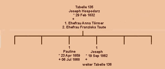 Die Trauungsurkunde habe ich noch nicht gefunden. Im Indexbuch ist aber eine Heirat des Joseph Hospodarz und der Anna Törmer verzeichnet. In der Taufeintragung von 1862 zur Geburt des Sohnes Joseph lesen wir: