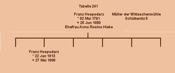 In den Matriken finde ich nur die Geburt des Franz 1813. Hatten sie wirklich nur ein Kind? Merkwürdig ist auch, dass im Mannschaftsbuch von Schüttenitz aus dem Jahre 1848 als Bewohner des Hauses Nr. 5 nur Franz Hospodarz (57 Jahre) und eine Rosina Darius (42 Jahre), eine Theresia Darius (18 Jahre) und eine Anna Darius (2 Jahre) aufgeführt sind. In den Sterbematriken finde ich keinen Sterbeeintrag von der Anna Rosina seiner Ehefrau. Wo ist sie geblieben? In welchem Verhältnis die Darius zum Franz standen ist nicht geklärt. Sein Sohn Franz ist in diesem Mannschaftsbuch auch nicht aufgeführt. Ist er vielleicht beim Militär?
