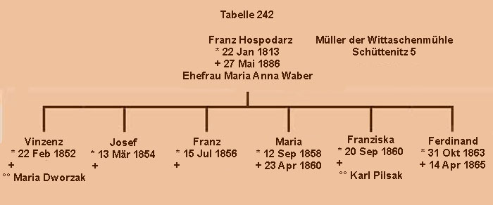Franz Hospodarz heiratete um 1851 die Bauerstochter Maria Anna Waber aus Hlinai Nr. 10. Beachtlich war, dass Franz bald 40 Jahre wurde. Die beiden hatten sechs Kinder.
